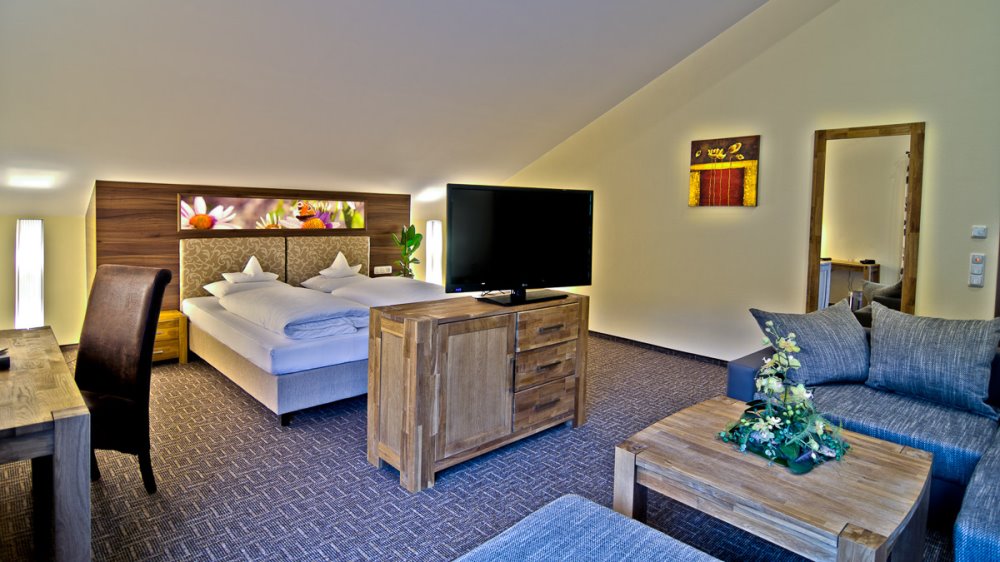 Ausstattung im Hotel: Das Hallenbad mit breiter Fensterfront bietet einen tollen Ausblick und hat direkten Zugang ins Freie zur Liegewiese, Saunalandschaft in moderner Holzoptik,Tageslicht Ruheraum mit schönem Blick ins Regental, Trainingsparcour in der Halle und im Freien, Krafttraining mit Anleitung an unseren Fitnessgeräten, Wellness-Arrangements mit kompetenten Masseurinnen und Kosmetikerinnen. Sie wohnen in gemütlich und liebevoll eingerichteten Einzel- und Doppelzimmer, Appartements und Suiten jeweils mit Dusche, WC, Telefon, Flat-TV und Balkon oder Terrasse mit 4-Sterne-Hotel-Standard. Weitere Panorama-, Luxus-Doppelzimmer, Studio sowie Suiten mit luxuriöser Ausstattung
