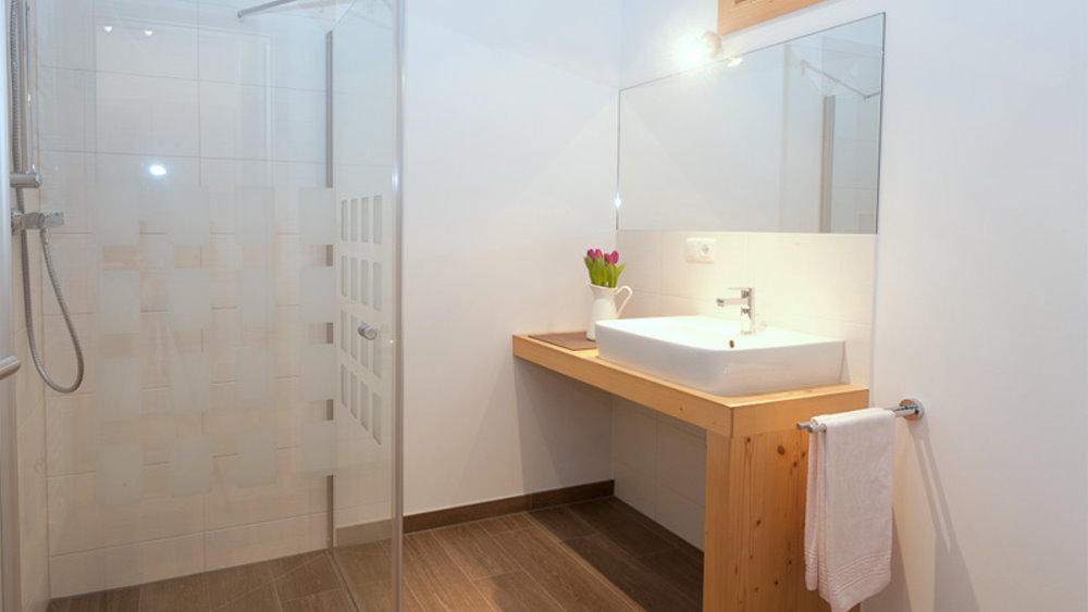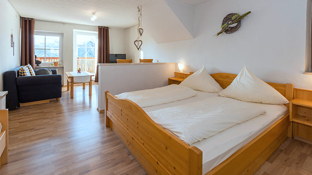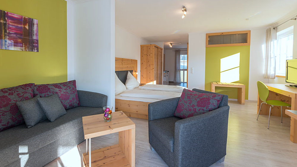 Komfortzimmer im Landhausstil aus einheimischer Fichte mit zwei bis vier Betten, DU/WC, TV, Kühlschrank, Esstisch, Sitzecke, WLAN und Südbalkon zum Garten.