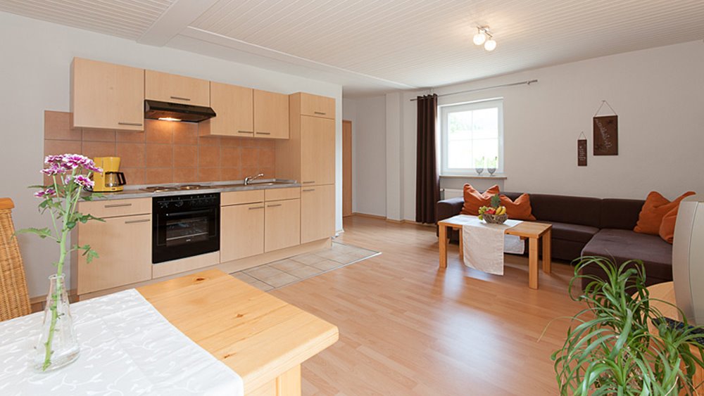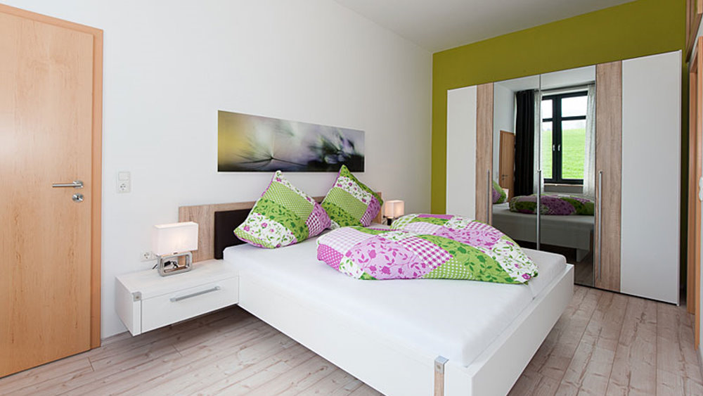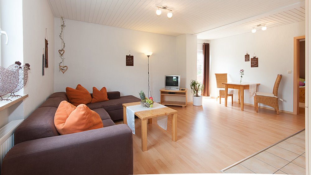 Neue moderne Ferienwohnungen im EG mit vier Betten (Doppelbett + Etagenbett, bzw. extra Kinderzimmer), Wohnküche, Schlafzimmer, DU/WC, Esstisch, Sitzecke, Flat-TV, Radio, WLAN , Tassimo Kaffeemaschine.